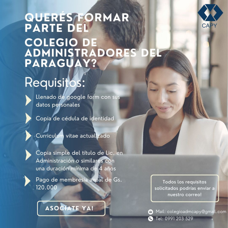 COLEGIO DE ADMINISTRADORES DEL PARAGUAY NUESTRAS ACTIVIDADES DESTACADAS ACTIVIDADES DEL CAPY Más información XXVI CONAMERCO 2025 Más información CONVENIOS 2025 Más información Inscripción para nuevos socios: Conoce los requisitos para formar parte del CAPY Formulario de Inscripción para formar parte del CAPY Beneficios de formar parte del CAPY SEGUINOS EN NUESTRAS REDES SOCIALES Facebook Instagram